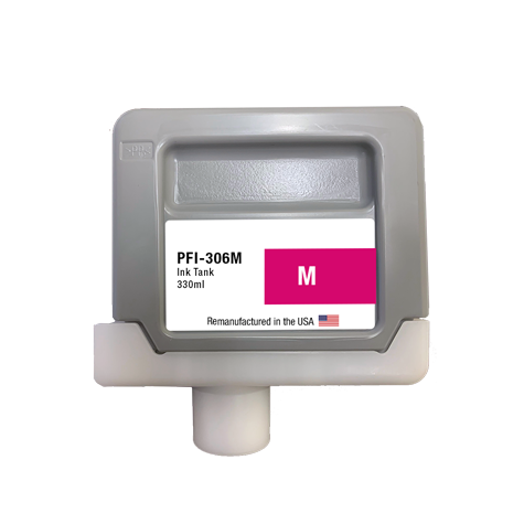 U.S. remanufactured Canon PFI-306 330ML Magenta ink cartridges are the highest quality wide format replacement cartridges on the market. Using only original Canon PFI-306 Magenta cartridges, we remanufacture each cartridge to the highest quality standards to match OEM ink level, color, and performance guaranteed!